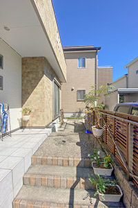 タイルデッキの高さをリビングの床の高さにあわせ、リビングから外をみた際に空間が広く、続いて見えるようにしました。