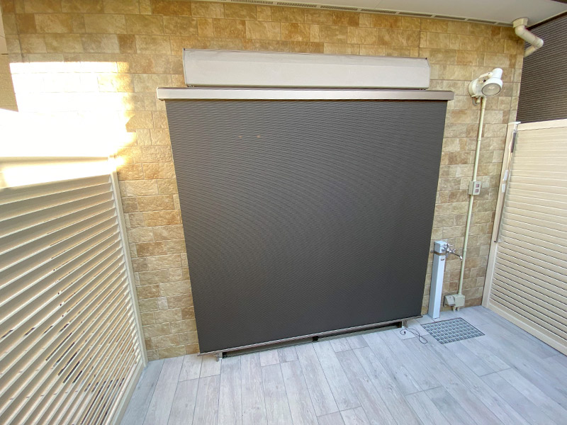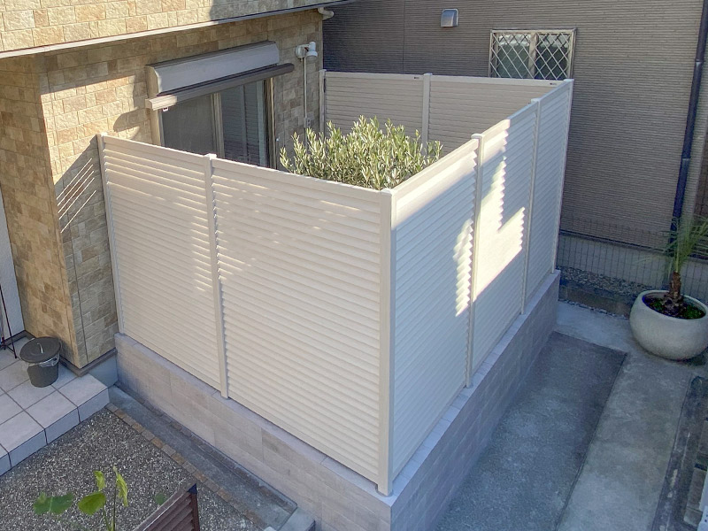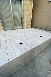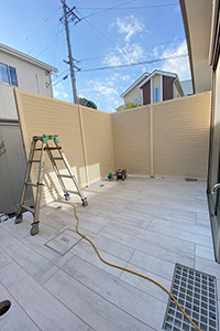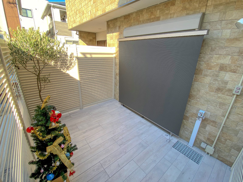 フェンス:YKKap ルシアスシリーズ スクリーンフェンス S07型 日よけ:LIXIL スタイルシェード 床材:LIXIL 木調床タイル バサーティル 床埋込照明:KOIZUMI バリードライト 埋込式 立水栓:カクダイ(柱:624-125、水栓:7015-13F、701-302-13、水栓パン:624-951) |