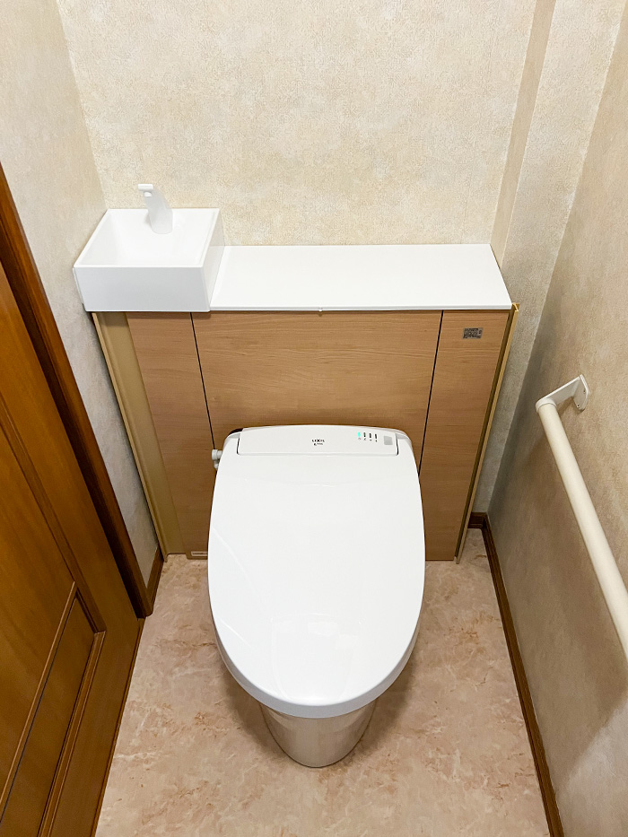 「収納が欲しい」とのご要望がありましたが、棚を置くとトイレが狭くなってしまうので、ちょっとした掃除道具などが背面キャビネットにしまえるリフォレをご提案しました。
